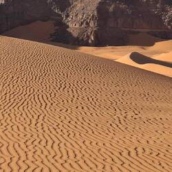 Sandfilm mit winzigen Eisenerz-Körnern überzogen. Im nächsten Tal ändert die Farbe auf gelb oder später auf rot. Die Veränderungen sind typisch im Tadrart und lassen immer wieder überraschen.