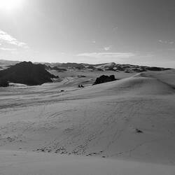 Mittagessen wieder unter einem Überhang, Müdigkeit nach einer schlechten Nacht, Weiterfahrt durch Steintäler, an riesigen herangefallenen Quadern vorbei, die schwarz am Fuße der Sandsteinberge liegen. Das Eisenmangan, das oxidiert, ließ sie so über die Jahrtausende werden. Gebauso auch schlussendlich die schwarze Wüste. Dünenformationen in wie immer rötlichen Sand, überzogen von schwarzem Manganeisen, das am Magneten hängenbleiben würde.