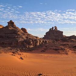 Am Vormittag wandern Sie zu Fuß zu den weißen Dünen. Nach der Mittagspause besichtigen Sie den Doppelbogen von Bouhadian und den „Igel". Der heutige Übernachtungsplatz ist in der Nähe des „Amenokal“ und bietet eine traumhafte Kulisse.