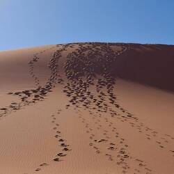 Dünenwanderung. Die Füsse suchen den festgebackenen Sand, um Halt zu finden, im weichen müssen sie fast den gleichen Schritt wiederholen.
