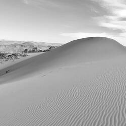 Die Dünen wachsen an den Bergen hinauf wie gelbe Skipisten. Nach einer ausgedehnten Mittagsruhe, in der ich weiter STILLER nachlas, der so entscheidend für mich war und ist, so nachvollziehbar, weil viele Geschichten auch mir bekannt sind und der vor allem in der Sibylle-Erzählung so prägnant die Sicht der Frau, meiner Meinung nach auch heute gültig, geschildert und nachvollzogen hat, brachen wir nach Mouln'aga, Kamellippe auf, Höhepunkt der Reise mit den Dünen, die 400 oder 500 Meter hoch sich an Berge angelehnt und dann überwuchert haben. Der Wind formten ihren Kamm. Wir steigen empor, ich barfuß, was keine gute Entscheidung war, da der Sand wirklich heiß ist und die Sohlen fast verbrennt. Schatten werfen berückende Formen auf den Boden, immer wieder bis zum Horizont oder zum blauen Himmel empor muschelförmige, sich windende Gratverläufe. Einmalig.