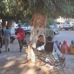 Jetzt alleine, nach zwei Wochen Gruppe. Alleine in einem Café voller Männer. Fast alle am Handy, mit Schlappen, Trainingsanzüge, nur einer in Kaftan. Sie sprechen Temaschek, ich verstehe kein Wort. Vor dem Café zwei Busse, in einem Kinder, die warten, bis es losgeht. Polizei gegenüber, Nachmittagshitze, gemächliches Tempo.