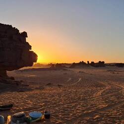 bei Ouan Zaoutan verbringen. Am frühen Nachmittag fahren Sie weiter durch die abwechslungsreiche Gegend bis nach In Tehak. Wer sich noch etwas sportlich betätigen möchte, kann die hohe Düne zum Sonnenuntergang erklimmen, um einen atemberaubenden Ausblick auf das Meer aus Dünen und den Sonnenuntergang zu genießen.