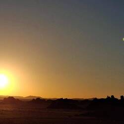 Am Nachmittag startet der Linienflug (ca. 3 h) mit Air Algérie von Frankfurt über Algier und am späten Abend der Weiterflug zur Wüstenstadt Djanet, der auf 1000 m Höhe liegende Hauptort des berühmten Tassili N‘Ajjer-Nationalparks. In der Nacht Begrüßung und Abholung durch unsere Tuareg-Mannschaft und kurze Fahrt ins 20 km entfernt liegende