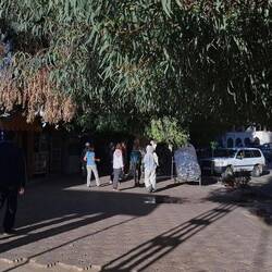 Endlich um 3 Uhr nachts angekommen. Im Gepäckabholungsraum des kleinen Flughafens mehrere Reisegruppen, dazwischen Beamte und Tuareg in ihrer Kleidung, den herum gebundenen Turban, das sackähnliche Überbleibsel, manchmal blau, manchmal weiss, oft dunkel. Fahrt durch die Nacht, 30 km, nach Djanet. Beleuchtete Straßen, Neubaugebiete in der Nacht, Hügel, die mich an den Film 5G erinnern. Schließlich Grand Hotel des Ambassadeurs, ich falle ins Bett und erwache mit blauem Himmel, Blick nach Lybien über graugelbe Ziegelhäuser, eine Straße, einen Verkaufsstand unter Sonnenplane. Busse, ein paar Autos, zweimal Polizei, dann die aufsteigende Steingarten, gelber Sand davor, ein schrundiger, wie von Gletschern zerschrammter Berg zur linken. Es gibt ein reichhaltiges Frühstück in einem schattigen Patio. Leichter Windhauch un den grünen Bäumen, Steinformationen im Sand, aufgeschichtete Kalabassen, Vogelfutter in flachen, aufgehängt Strohtellern. Die Tour geht los, ungewohnt für mich, nicht eigenen Gedanken und Plänen zu folgen.Read more