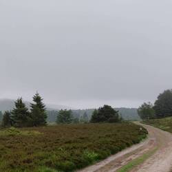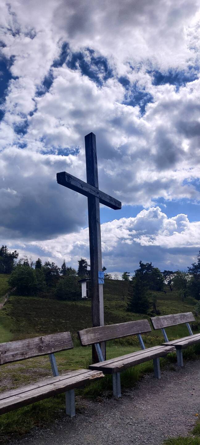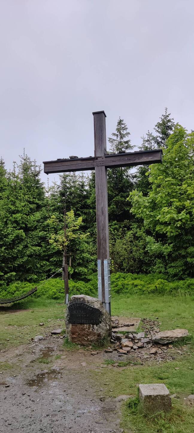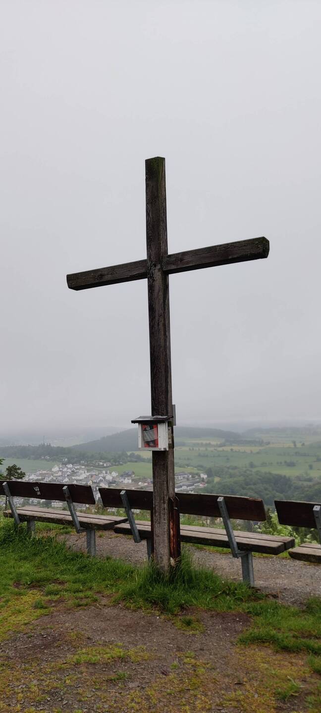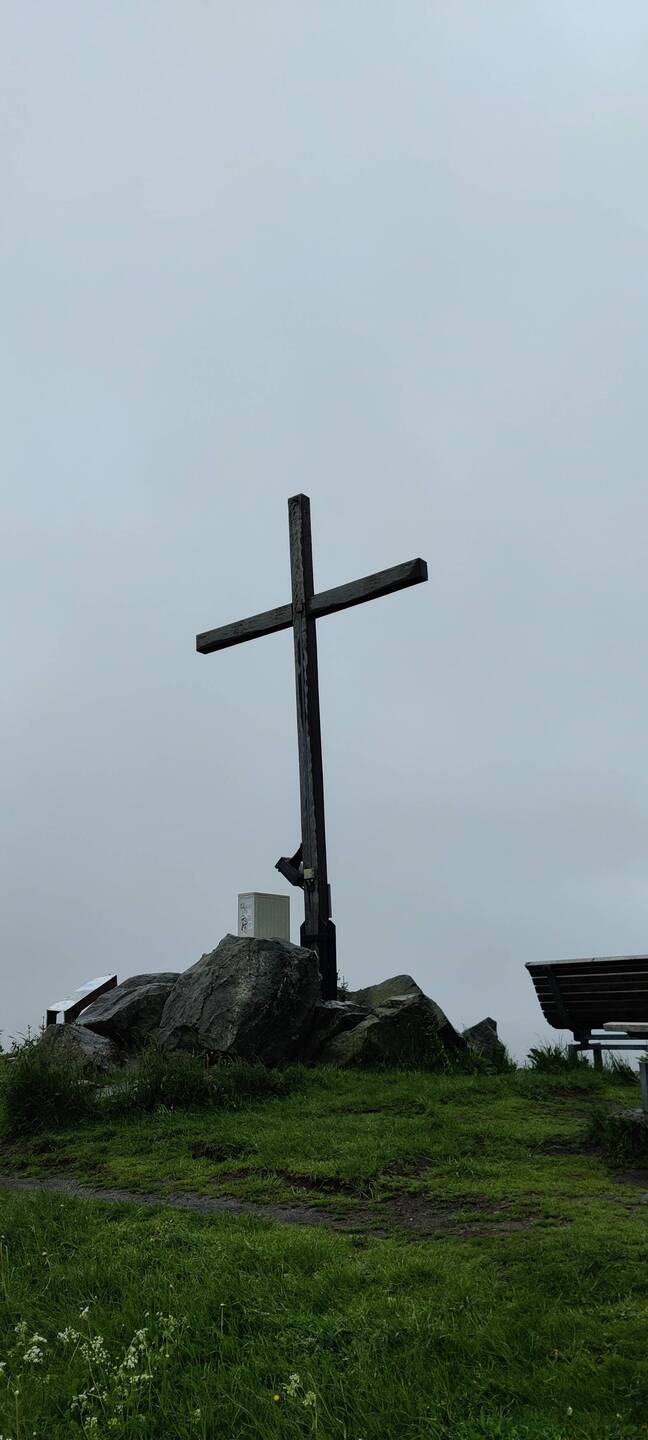 Nach einen kurzen Anstieg bin ich wieder am Gipfelkreuz von gestern Nachmittag. Die Sicht ist heute nicht so gut von hier oben 🌧️☁️.