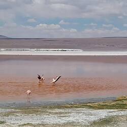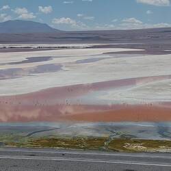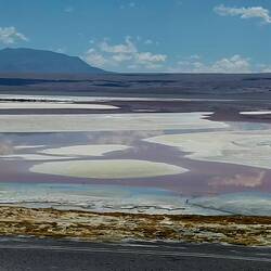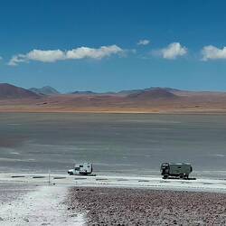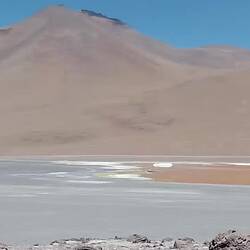 Hab ganz schlecht geschlafen heute Nacht. Ohne Kaffee machen wir uns auf den Weg zum Aussichtspunkt an der Lagune Colorada. Es schaut garnicht weit aus, aber die Piste führt weit außen rum. Es istBaca lagi