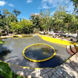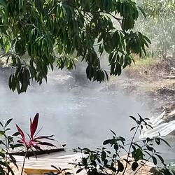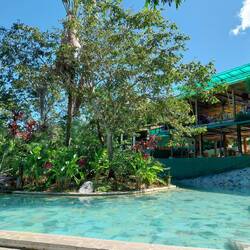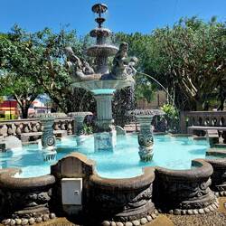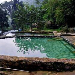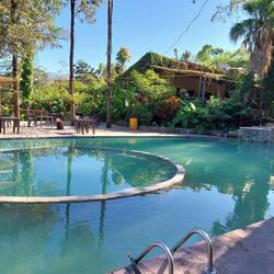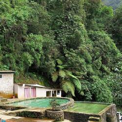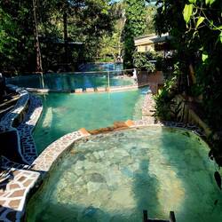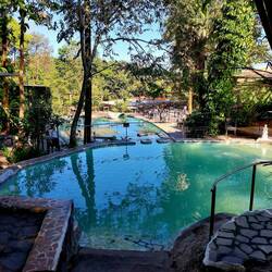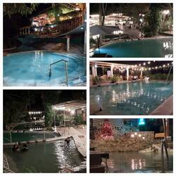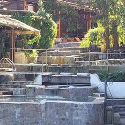 Wir haben heute den ganzen Tag hier in den Thermen verbracht. Es gibt viele schön angelegtes Becken, das Wasser ist von ganz heiß bis kalt erfrischend. Über der ganzen Anlage wehtLeia mais