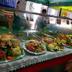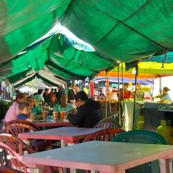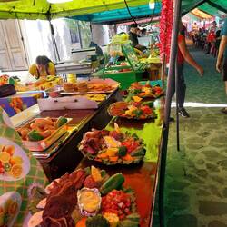 Der öffentliche Bus bringt uns für 0,20€ pro Person nach Juayua. Am Wochenende ist hier Foodmarket. Am Hauptplatz sind zwei lange Fressgassen aufgebaut und die ausgestelltenLeia mais