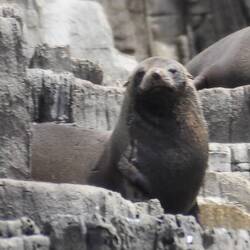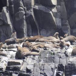 Nach einer guten Stunde ging es zu den Seals (Seelöwen), es gab einen 20 minütigen Sprint … gut das wir angeschnallt waren. Bei der Kolonie angekommen, gab es wieder reichlich Infos und Möglichkeiten für Fotos, erst die Damenkolonie und dann ging es zu den Männern, bis zu 400 kg schwer lagen sie auf den warmen Felsen und sonnten sich.