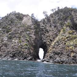 Dann ging es raus aus der Bucht, es ging entlang einer Steilküste mit Caves (Höhlen), interessante und spannend Felsformationen gab es zu sehen und oben drauf eine intensive Eukalyptusbewaldung und dazu bei den Zwischenstopps viele zusätzliche Informationen (und die Möglichkeit im Stehen zu fotografieren). Bruny Island wurde übrigens in den 60er Jahren zu drei Viertel von einem Buschfeuer weitestgehend zerstört (zur Erinnerung, das große Buschfeuer auf Kangaroo Island war 2019), die Bäume haben seit dem nicht wieder die ursprüngliche Höhe erreicht. Zurück zur Cruise … es folgen Ausbuchtungen, Felsen im Wasser, begrünt und nackt und dann wechselst der Fels zu Sandstein, was wieder ganz andere Ansichten und Einblicke gibt.