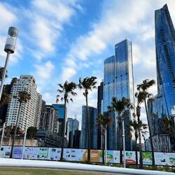 Aber noch ein paar Worte zum parkrun … es gab ein professionelles und gutes Briefing, das um 7 Uhr 25 auch schon beendet war, los ging es aber dann erst pünktlich um 7 Uhr 30 auf die Out-and-Back Strecke, die man zweimal bewältigen musste. Es geht entlang der Bay mit schönen Aussichten auf die Skyline von Singapur, die andere Seite wird derzeit begrenzt durch einen Bauzaun. Es lohnt sich sicherlich hier in, keine Ahnung, ein paar Jahren, nochmal vorbeizuschauen und das Erholungs- und Freizeitgelände, dass gerade dort gebaut wird, nochmal in Augenschein zu nehmen. Die Zeichnungen am Bauzaun erinnern an die Erde in den Star Trek Filmen.