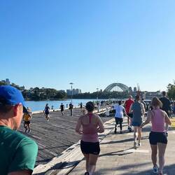 Das First Timer Briefing wurde von Stephane gehalten … wir befinden uns in Streckenmitte, es geht erst Richtung Harbour Bridge, dort eine kleine Schleife drehen und zurück zum Start und dann in Richtung Anzac Bridge, dort eine harte Wende, wieder zurück und das ganze noch einmal … dabei geht es teilweise über uralte, knarzende Holzplanken, die sehr uneben sind, also Augen runter und nicht zur auf die Brücken schauen … und immer schön Links laufen, wir begegnen uns bei der Strecke alle sehr oft. Neben uns gab es noch europäische 🇪🇺 Touristen aus England und Schweden. Das Hauptbriefing hielt dann Andrew, beide Briefings waren super und echt unterhaltsam. Apropos, die Strecke war auch sehr schön, was man nicht von jeder Out-and-Back Strecke sagen kann.