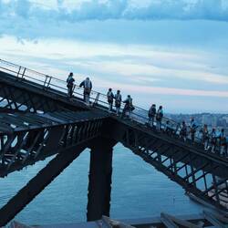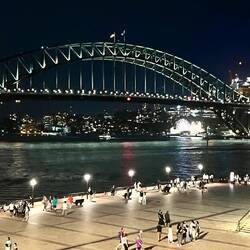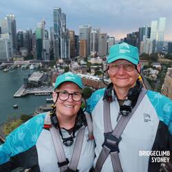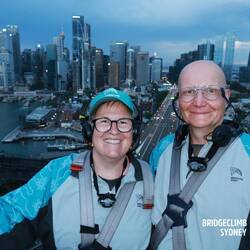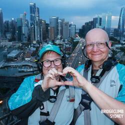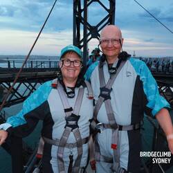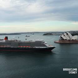 Kurz nach 17 Uhr waren wir bei der Bridgeclimbe-Station angekommen und wollten uns registrieren, was sich als kleines Problem herausstellte, da wir doch tatsächlich ohne Ausweise unterwegs sind, alles liegt sicher im Hotelsafe. … letztendlich wurde jeweils eine Kreditkarte aus der Handywallet akzeptiert, super👍, Problem gelöst, es kann losgehen …. Naja, nun gingen die Prozeduren erstmal los …. Sicherheitsunterweisung, Alkoholtest, dann musste alles bewegliche abgelegt werden (Uhren, Schmuck, Smartphones, etc.), danach gab es ein Ganzkörperkondom (Overall), an dieses wurden Brillen (so weit vorhanden) angeclippst, dann folgten Stirnlampe, Regenponcho, Käppi, Kopfhörer und der Gurt mit der Sicherungsleine. Noch eine Vorstellungsrunde, man muss ja wissen, mit wem man es die nächsten 2,5 Stunden zu haben wird. … es folgte eine kurze Übungsstrecke um mit dem Sicherungssystem vertraut zu sein und dann ging es los. … erst eine längere Strecke unter der Brücke auf einem sehr schmalen Steg, ehe es dann in den Bereich der Leitern ging, die es hinaufging, wir bestiegen die Brücke auf der Opernhaus-Seite. Nach den Leitern folgten die Treppen auf dem Bogen bis nach oben um dann schlussendlich auf der anderen Seite das ganze wieder hinunterzugehen. Unterbrochen von mehreren Fotostopps, wo wir in Kleingruppen fotografiert wurden. Schön waren diese Unterbrechungen, weil die, welche nicht gerade Fotomodell waren, viel Zeit hatten die Aussicht und das Treiben weit unten zu genießen und wir damit -was für ein Timing-das Ausschiffen der Queen Elizabeth live miterleben konnten.
