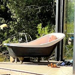 Beim Parkplatz das Auto abstellen, das Gepäck nehmen und ca. 200 m weiter auf dem Weg gehen, dann landet man bei den Pods. Es sind drei … der linke ist das Schlafzimmer mit der Badewanne auf der Terrasse, der mittlere beherbergt Küche und Bad und im rechten Pod ist das Wohnzimmer. Schlüssel gibt es keine. Versorgt wird die Unterkunft mit Solarstrom, Regenwasser und Gas zum Kochen aus der Flasche. Sollten wir zu viel Strom verbrauchen, ist er abends halt verbraucht 🤷‍♂️. … seine Frau hat uns ein Brot bereitgelegt, Müsli, Eier von den eigenen Hühnern sind da und was man sonst noch fürs Frühstück braucht, viel Spass dann! Und wenn was ist, einfach anrufen, falls man Netz hat oder vorbeikommen.