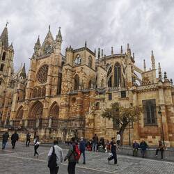 Heute machen wir einen Spaziergang durch Leon. Erst zum bunten Kunstmuseum Musac, das leider zu hat. Dann zum Kloster San Marcos. Auf dem Platz steht eine Pilgerstatue, sehr schön gemacht. Er sieht sehr müde aus. Wir sehen auch wieder sehr viele Pilger. Dann gehen wir ins Museum von der Basilika San Isidoro mit uralter Wandmalerei. Anschließend zur Kathedrale von Leon. Ich habe noch nie so eine beeindruckende Kirche gesehen. Innen kann man fast nicht hochsehen so hoch ist sie. Sie erinnert sehr an die Kathedralen in Frankreich. Anschließend bummeln wir noch durch die Stadt und beschließen heute noch nach Burgos zu fahren. Ca. 200 km. Wir fahren ständig auf einer Hochebene auf 800 hm und es gibt kilometerweit riesige Getreidefelder.