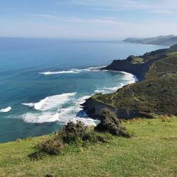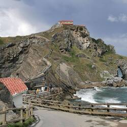 Morgens fahren wir auf einen Parkplatz in der Nähe von San Juan de Gatzelugatxe, eine Kirche auf einem Felsen im Meer, die man über viele Stufen erreichen kann. Es ist sehr windig. Der Platz überLäs mer