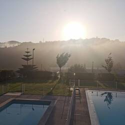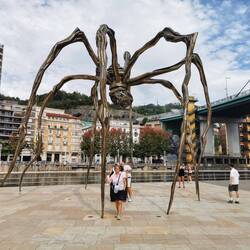 Morgens auf dem Campingplatz ist es noch sehr neblig. Später wird es sehr heiß. Dann geht's mit dem Zug nach Bilbao. Die Fahrt dauert 2 Stunden, ca. 85 km und kostet hin und zurück für 2 PersonenLäs mer