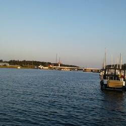 Net voor de brug leggen we aan aan lange steigers in een mooie jachthaven en gaan lunchen.