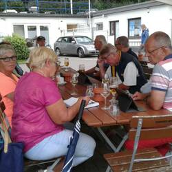 We houden aan het einde van de middag palaver op het terras van het restaurant en besluiten twee dagen te blijven liggen in Rendsburg en, omdat het zo gezellig is, blijven we gelijk ook maar eten...het diner is meer dan voortreffelijk en de sfeer zit er góed in.