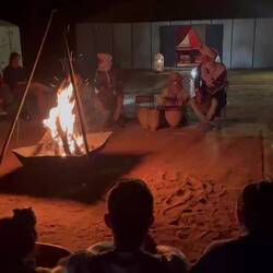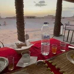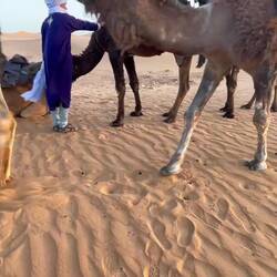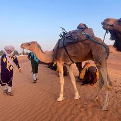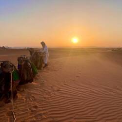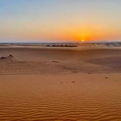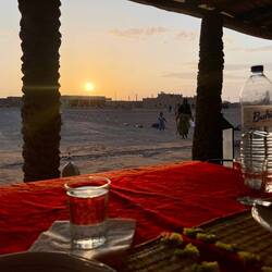 Wir sind pünktlich um 18h mit den Kamelen los. Das Aufsteigen und dann oben bleiben ist nicht ganz einfach. Nach 90 min machen wir oben auf einer Düne halt und schauen dem Sonnenuntergang zu. DerMeer informatie