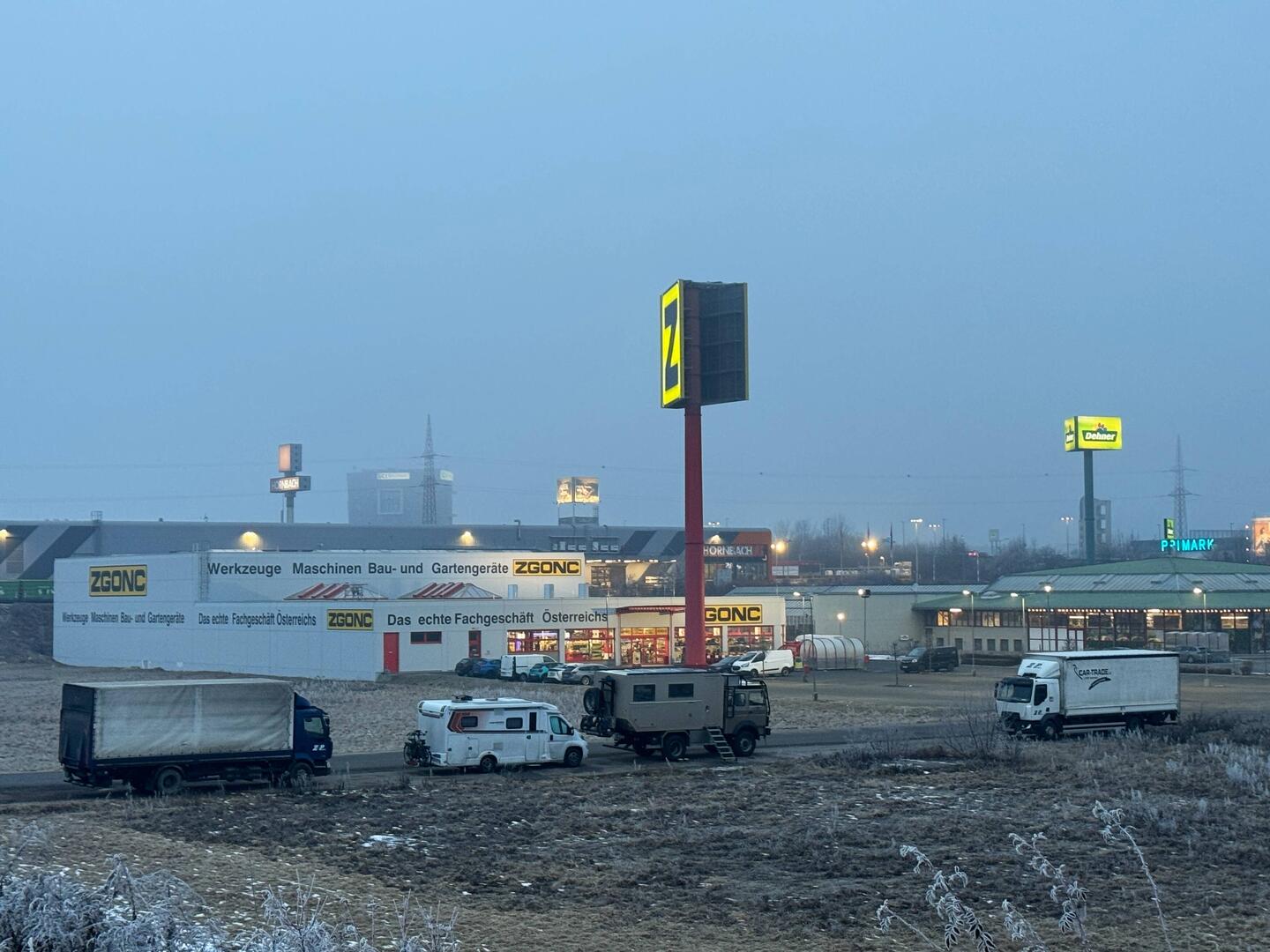 Ankunft in Graz - ein tolles Gewerbegebiet ( Seiersberg ) empfängt uns mit einem Trucker Parkplatz speziell für Schäferhund Fando - Tür auf und laufen - bestimmt 15.000 qm Fläche vor der Türe -Læs mere