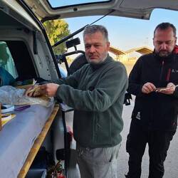 Fando wartet geduldig bis ich alles eingepackt habe und wir bereit sind für die Abfahrt. MARC hat schon das Funkgerät in der Hand und macht sich Sorgen, wo die anderen Teamkollegen denn hinfahrenBaca lagi