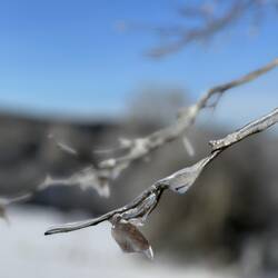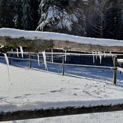 Die Sonne schmilzt den Schnee, der durch die eisigen Nächte immer wieder an den Bäumen gefriert. Lange Eiszapfen und skurrile Eisgebilde sind die Folge davon.