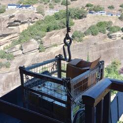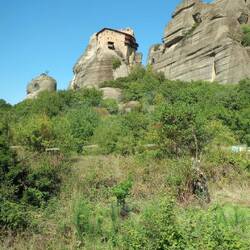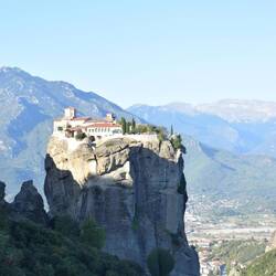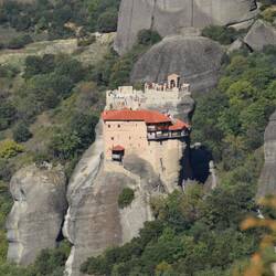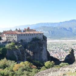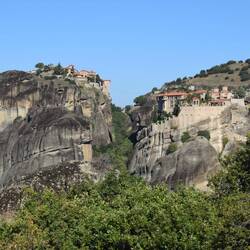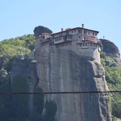 Wir übernachten in Kalambaka und fahren dann mit dem Bus hoch zum Nonnenkloster Agios Stefanos. Auf dem Weg sieht man hinüber zum Kloster Agia Triada das schon 1438 gegründet wurde. TiefeMeer informatie