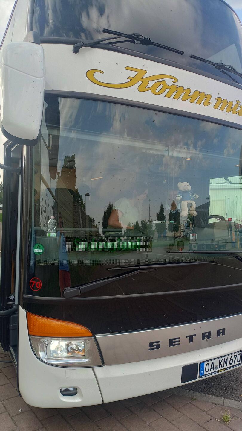 Der kleine Zubringerbus holt uns pünklich um 4:30 Uhr als erste Passagiere ab und sammelt auf der Fahrt nach Memmingen weitere ein. Dort werden wir auf zwei Bistrobusse aufgeteilt, einer fährt nachLeer más