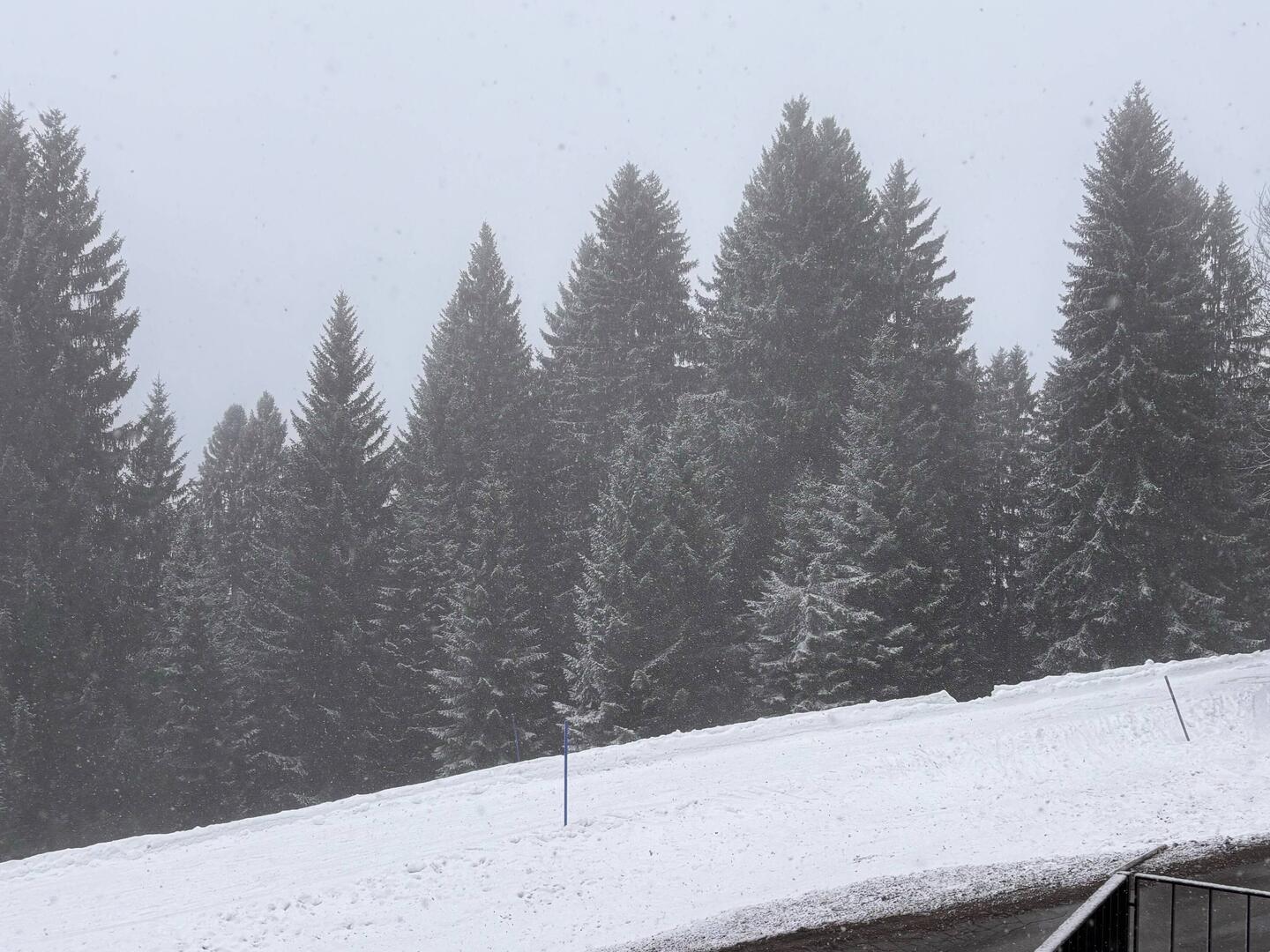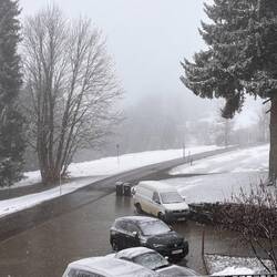 Das Wetter ist ein wenig trübe und es schneit leicht.