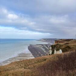 Im Gegensatz zu unseren bisherigen Stopps gibt es hier nur einen breiten Kieselstrand, von dem aus man aber einen tollen Blick auf die Kreidefelsen hat. Schöne Strandspaziergänge sind jedoch nur begrenzt möglich. Wir haben unseren Stellplatz oberhalb der Klippen gefunden. Nur wenige Schritte vom Camper aus hat man einen grandiosen Blick auf das Meer, die Küste und den kleinen Ort. Über Treppen oder mit einer kostenfreien Standseilbahn kann man in wenigen Minuten vom Klippenbereich zum Hafen und Stadtzentrum gelangen.