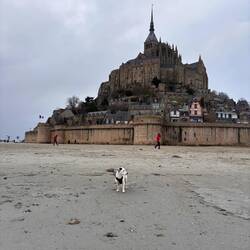 Der Mont-Saint-Michel ist eine der bekanntesten Sehenswürdigkeiten Frankreichs und gehört seit 1979 zum UNESCO-Weltkulturerbe. Ursprünglich wurde er im Jahr 708 als religiöser Ort gegründet. Über die Jahrhunderte entwickelte sich daraus eine mächtige Benediktinerabtei, die heute hoch oben auf dem Felsen thront. Darunter schmiegen sich enge Gassen, alte Steinhäuser und Stadtmauern an den Berg. Die Atmosphäre in den Gassen mit Restaurants, Cafés und kleinen Geschäften ist mega schön, mit Hund jedoch aufgrund der Enge stressig.