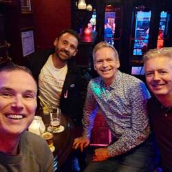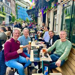 Originally we had planned to go to nearby Haarlem tonight to see my friend Dennis whom I’d met here 10 years ago, but since I didn’t want to worsen my foot injury, he said him and his husband John would come to Amsterdam instead. After getting ready, we caught an Uber to the Taboo bar in the Amsterdam gay street and had a drink whilst waiting for them.