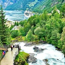 Any hopes I had of a sleep-in today were dashed when Ted woke up at 5am and decided to involve himself with every room activity possible, meaning I couldn’t fall back asleep. Since it was still too early for breakfast, we went and got a coffee at the Starbucks-like cafe which, just like the name suggests, serves awful coffee. This morning was also a good opportunity to enjoy our balcony, as we sailed through the fjords and admired views of all the waterfalls, from both there and from the top deck of the ship.