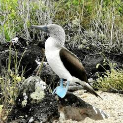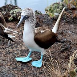 J172-J173 (du 25 au 26 mai) : Pour notre ultime jour à Santa Cruz, nous optons pour le tour de la baie en bateau à fond de verre 🛥️ et allons à la rencontre d'une énième espèce emblématique des Galapagos, les fous a pattes bleues (allias bubbies). Comme tous les autres fous, ces oiseaux marins sont des pêcheurs hors pair qui plongent tels des kamikazes pour attraper leur proie 🐟. Ils se distinguent grâce à la couleur de leurs pattes d'un bleu cyan intense.