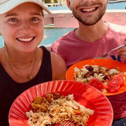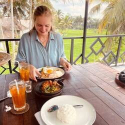 Ob wir auch mal chillen? Oh ja 🥰 das ist heute der Fall! Wir wachen auf und haben direkt das Meer vor uns - wie schön! Zum Frühstück gibt es Mango-Bananen-Pancake und Rührei mit TomatenchutneyBaca lagi