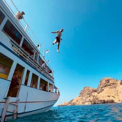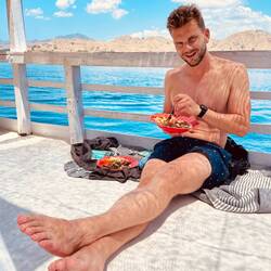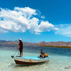 Ausgestattet mit Flossen, Taucherbrille und Schnorchel erkunden wir die bunten Korallen, Fische und andere Tierchen der Unterwasserwelt. Das Wasser vor der kleinen unbewohnten Insel ist kristallklarBaca lagi