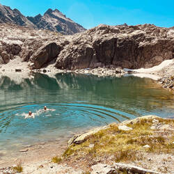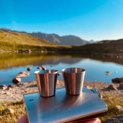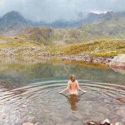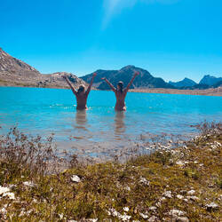 Zum Mittag gibt es die restlichen Kässpätzle von gestern am Brüllersee. So langsam gewöhnen wir uns an unsere einsamen FKK-Bergseen in netter Mädelsrunde.