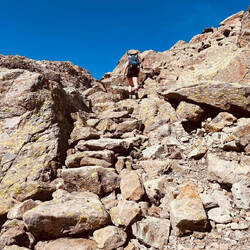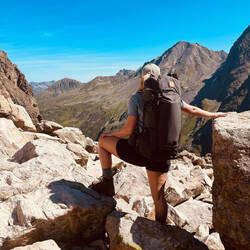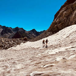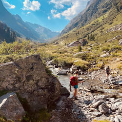Die Gletscherfrische hielt nicht lange an, denn der Aufstieg aufs Gstansjöchl (2573 m) lässt uns beim Klettern auf allen Vieren schwitzen. Anschließend steigen wir 900 m ab zur Konstanzer HütteEn savoir plus