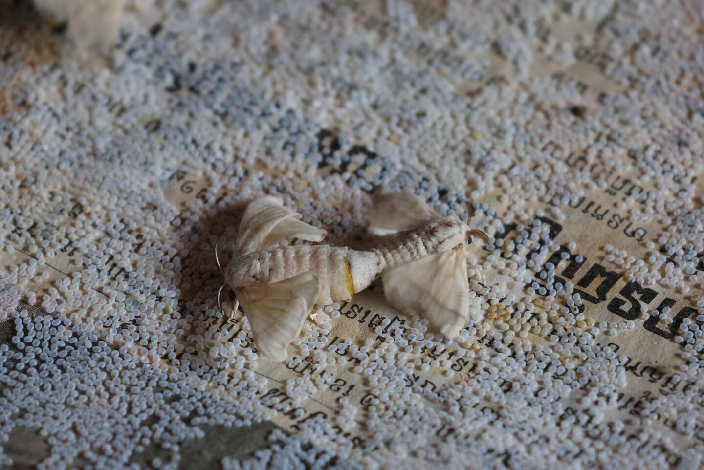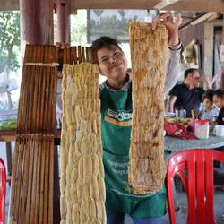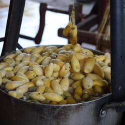 The process is very interesting. They have moths which breed (for 10 hours and then the male dies!) and make eggs, then the worms come out and get bigger. When they are ready, they put them in branches for them to do their cocoon. After a few days, they pick the cocoon and boiled them (and yes, the moth is still inside and dies in the process). They keep 20% of the cocoons to live to be able to breed the next worms.