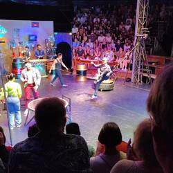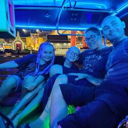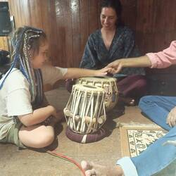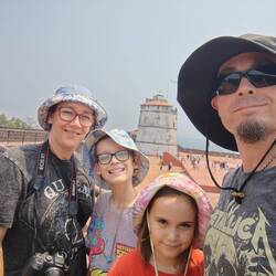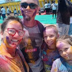 15.3.2025. We're going to a Holi Festival today, not sure what it's all about but we're gonna have a go. A short taxi trip to the outskirts of Mysore, we were there. We got our wrist bands and our free drink, Andrew got two cokes since Emma doesn't like soft drinks and there was no other choice. Mel and I got a beer each. The music was pumping, geez it was loud, or I'm old. There's this big framework setup in the middle with sprayers pointing down, soon after it all started they turned the water on. I never got completely drenched, but the water was nice against the Indian sun. We were given bags of colourful powders to chuck around at each other. Holi is a Hindu festival celebrating the beginning of spring and other things. We had a few people put colours on our face and wish a “happy Holi”. It was a fun atmosphere, people dancing and singing and just enjoying being with each other. I had fun, I think the kids did too. They danced with us, with each other and with some of the locals, though they needed a little encouragement. There was a buffet set up, all included with our tickets which really wasn't much. We had a few photos taken, which I didn't mind here, as here we were part of the people sharing something. We were all getting buggered, so we ordered a taxi and left the locals to party. We got back and went straight into the shower, the colours took a lot of washing off. We rested then played some games. Went out for dinner later and found a shop selling lots of Indian sweets. Mel and the kids bought a small selection to try. Had some as a dessert while watching an episode of blown away. Bed time.