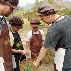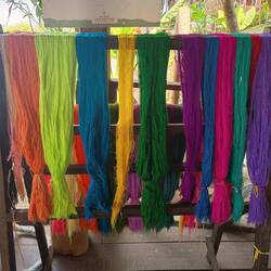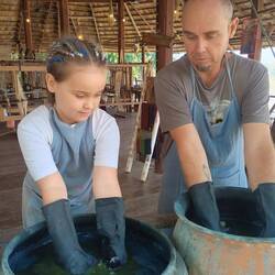 Then they grab one tiny strand of the cocoon and spool it on a wooden instrument. They need 20 strands for one thread. They can get 800 meters of strand with one female cocoon (500m for a male as they are smaller). Then they dry them, clean them in water mixed with ashes to make them smooth, color them with only natural ingredients (dragon fruit for purple, mulberry leaves for green, yellow is the natural color of that type of silk…). Then they can make fabric, scarves, dress….