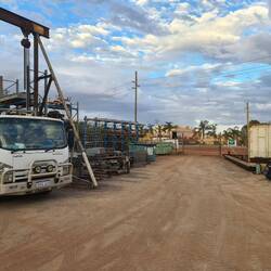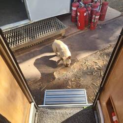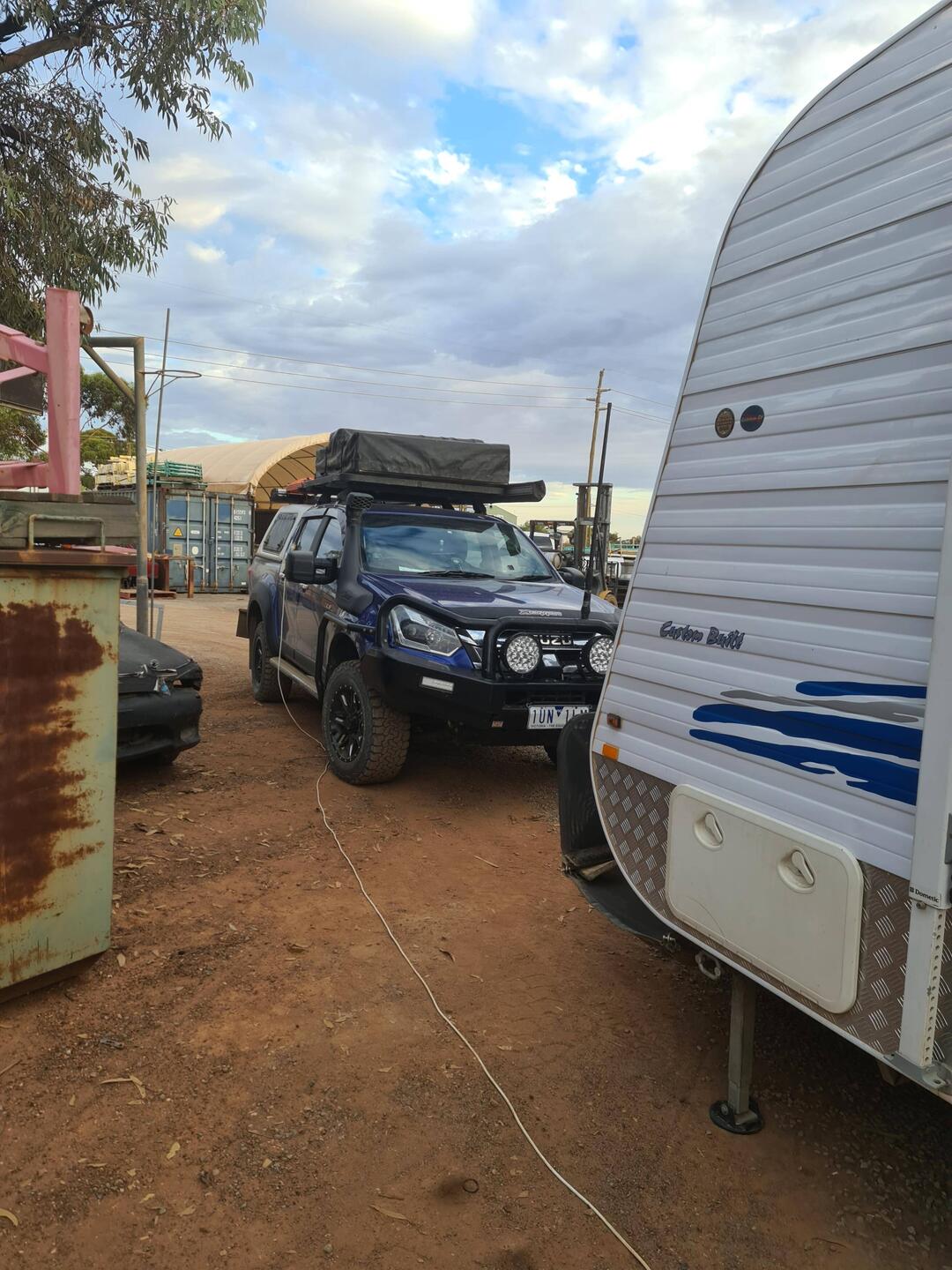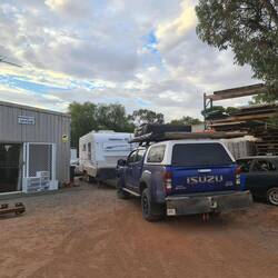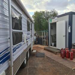 After our swim we drive back here - surprised to see our caravan is not where we left it. Damian has already moved it onto his block, so it's in their enclosed yard. We are warmly welcomed by Damian, Tina, Ben and their dog Charlie (she). After our greetings, we are shown about the block so we know our way around - told to make ourselves at home. Our caravan is parked beside their laundry, which also has a shower and toilet - that we can use. We all have a drink together in the office area, which has a kitchenette and dining table and chairs. We'll be very comfy, staying here as their air-conditioning works a treat. We decide to organise our own teas, then eat together in the office. We go off and organise for this, and I have a shower. Roger and I have airfryer chicken tenders with salad. Followed by super dooper iceypoles supplied by Damian and Tina. Damian and Tina very kindly take us on an evening drive about tour of Kalgoorlie. We enjoy wonderful lookouts, as well as checking out some of the hotels - we have a drink at the Exchange Hotel with its Skimpies bar which has a good live band playing, Some more driving around before getting back here at around 11pm. Very enjoyable outing. We're all happy to call it a night, Roger goes and has a shower and I relax in our caravan doing this. Time for bed.