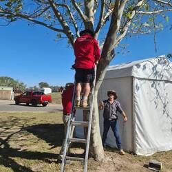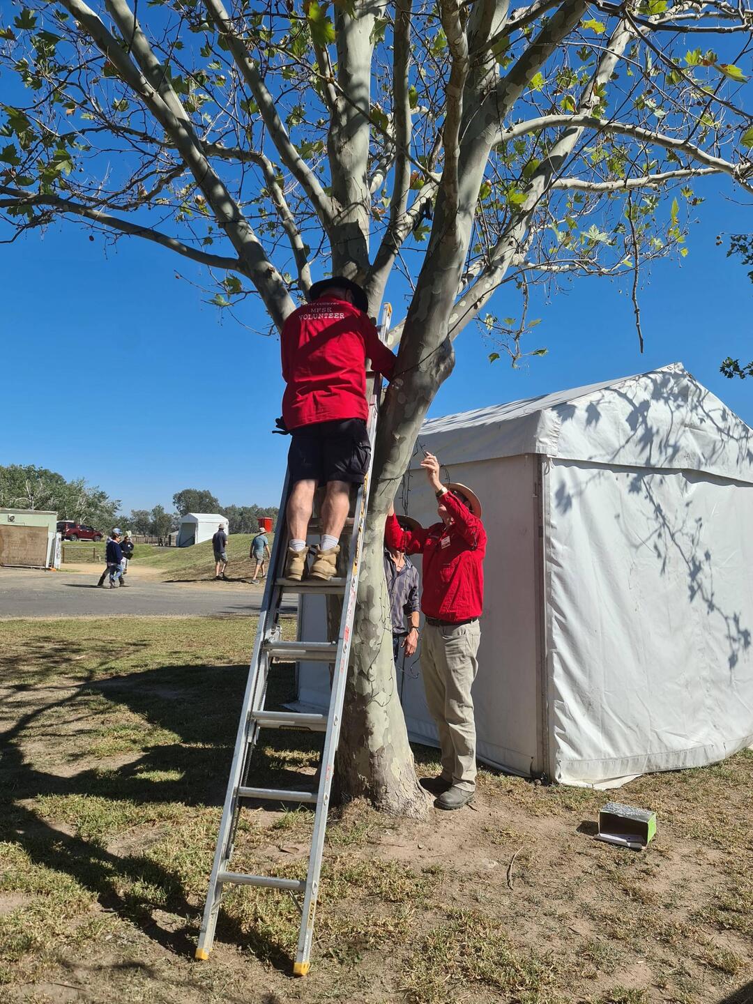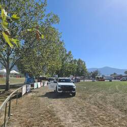 Get here in plenty of time for our 9am 'start'. Join other vollies at the Volunteer Hub and sit around waiting to be given instructions on what jobs we can be doing. While waiting Lisa and Tony arrive - they're meant to be on a 8am to 10am shift doing something down the main street - but apparently not required to do this, so they've come here to see what else they can do. Wait with us! Peter (one of our Logistics co-ordinators) arrives looking for the couple who did the fairy lights around the trees last year....David and Val respond. They are quickly nominated to lead a team of 6 vollies to get this task done. Lisa, Tony, Rog and I happily get into this crew. This task involves putting up fairy lights in every 2nd tree around the oval. Roger and I work together, and Tony, Lisa and Vlado form a team as well. Roger and I have David join and work with us. This task probably takes around 1 and a half hours then we have morning smoko break. After this, I take Lisa for a drive in our ute to get down the street to the Volunteer office to collect hers and Tony's Volunteer kits. We return back to Roger and Tony to find they are waiting around still for our next job to be organised. By the time Tony and Lisa have their new Volunteer shirts on - there is a job we can help with - putting up eucalypt branches around the oval. This involves a trailer with fresh eucalypt branches being driven around the oval, stopping around every third post to have 2 vollies drop off branches to be cable tied to these posts. Roger and I worked together to get these branches secured to the posts - Lisa and Tony did the same, we alternated around the oval until completed. Now lunch time - nice young fella is serving food at the Volunteer Hub today - he informs us that as long as we are rostered on today (doesn't matter how long) we are welcome to have lunch provided. So we enjoy a nice meat and salad roll with 3 small Easter eggs and cuppas before finishing for the day. Now around 1pm.