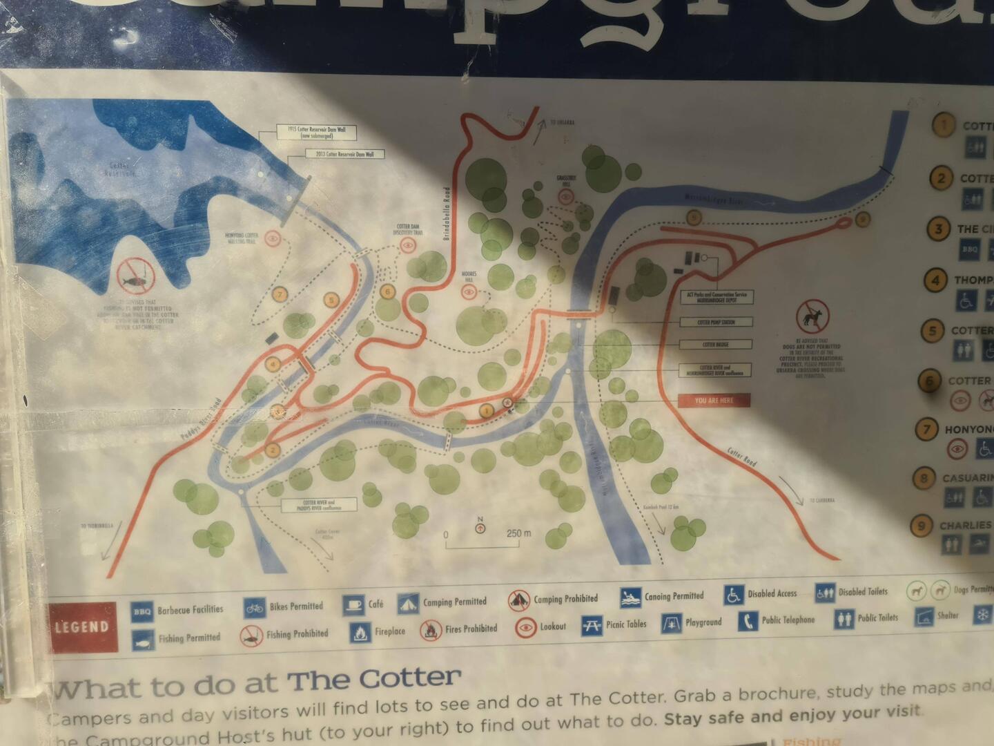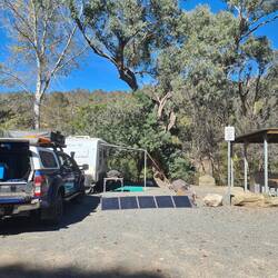 On our way here, we stop at an Aldi for Roger to do some grocery shopping. I stay in the ute and give Sharon a call (wondering if she'll be with Barb) - she is, so I get the opportunity to chat with them both. Barb is about to leave Halls Gap to go and visit Adrian - as his change of condition is so serious, it just needs to be taken one day at a time, Barb will try and help Adrian with this I can tell. I can only imagine I would be 'over thinking' like Adrian - but as Rog says - this is a good thing in its self. Adrian looking to deal with what's happening. After I finish my 'best wishes and look after yourselves too' call. We get on our way to arrive at this lovely spot. We select our site - Roger happy, it gets the most sun - I like that we're near BBQ and picnic tables. We do 'proper' set up, mat and awning out. Time for lunch, Roger has a meat and salad sandwich, I heat up the last of the leftover sausage surprise and have it on toast. We relax for a while, then Roger goes for a stand up paddle board on the river (nice and calm, clear water not that deep). After this we go for a walk to check out our surrounds - this is a very nice spot. We decide to go for a drive - to get some mobile service (none at campground) so we can check if any news from Barb - and I can load some maps of this area. No news, except Jen and Michael let me know they've heard about Adrian (Sharon), and I get the maps loaded. We return to camp, and get the fire going in the provided fire pit. Roger is doing a roast (boned lamb) with roast vegetables and gravy - so I have fun doing a small batch of scone dough to cook in the campoven for our dessert. All works out nicely. Roger goes off to have his shower, I start washing the dishes. Roger back in time to dry and help put them away. Now for a cuppa, then relax inside the van until bed.