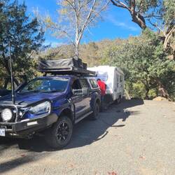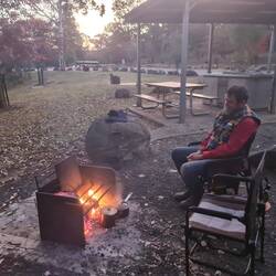 I get back from my walk just before 2pm, happy to get myself some yoghurt and a banana and sit for a while! Roger tells me I've missed nothing at camp, after his walk he's been relaxing reading a book and taking care of having his lunch etc. I decide I'd like to go for a 'cool down' walk and check out what Roger did this morning. I leave at 3pm and return 4pmish. Definitely time to have a shower now - enjoy that very much, good shower here (on a 3.5 minute timer). Now sit and relax with Roger around the fire he has going in the provided fire /cooking pit - drinks in hand. Tea tonight, Roger roasts some vegetables in the camp oven, and boils up other veggies as well to go with the leftover roast meat from last night. Fresh gravy as well. I make up another small batch of scones - 2 each - for dessert, done in the camp oven as well. Taste good with jam and 'spray' cream. Cuppa time, then Roger goes and has his shower, I get the dishes washed. Now time to relax until bedtime - I'm writing this up. I get to bed before 8.30pm - that hasn't happened in a long time!