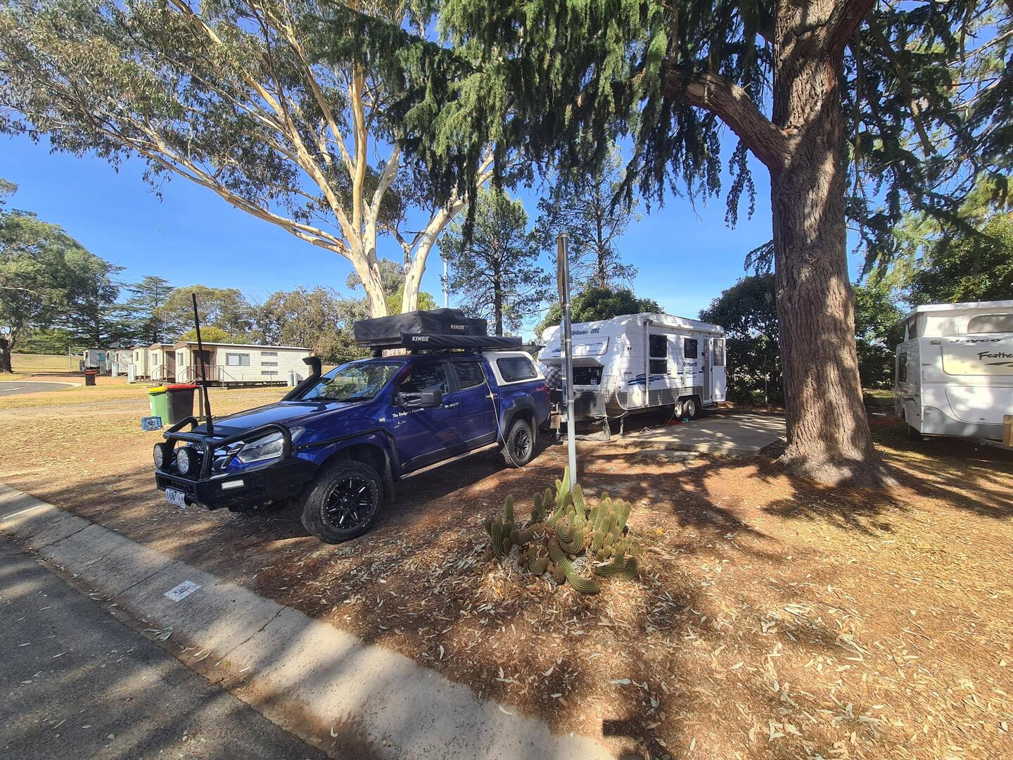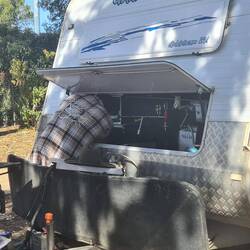 Book in here for 2 nights - chance to get washing done and for Roger to install new charger and check he's got it operating properly. We're on site 24 with power - abit tricky to get caravan lined up with the concrete slab (lack of space to manoeuvre) but Rog gets us there. Unhitch and Roger gets to work with the charger installing. I go get 2 loads of washing going.