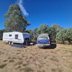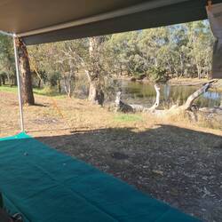 This campground is just on the outskirts of Gundagai. Lovely spot beside Morleys Creek. We set up with awning and mat out - facing the creek.