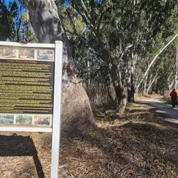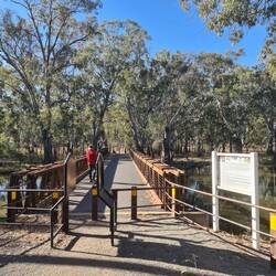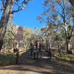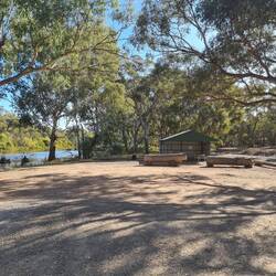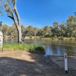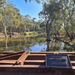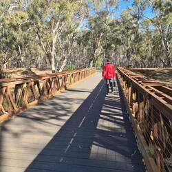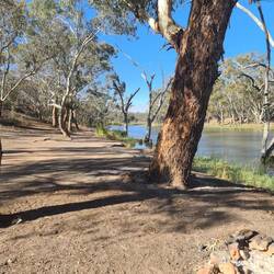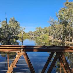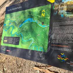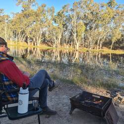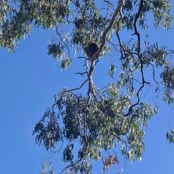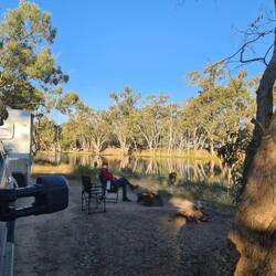 As soon as we arrive we're both sure we'll camp here! We just pull up and park so we can go for a walk to suss out our campsite options. Yay - where we've walked into, Roger should be able to get the caravan in (turns out it was a tight squeeze to turn around) - he does and we're both in agreement on the site too! Just gorgeous, parked beside the water. We get ourselves settled - Roger leaving the ute hitched, and not worrying about the mat or awning - so quick set up. Next we go for a walk to see if we can find any koalas....on our nice walk to Rocky Waterholes Bridge and beyond we see 1. Return to camp, time to relax. We have a visit from 2 ladies driving by - they're from the Visitor Centre and they're looking to photograph people fishing for marketing. Not Rog and I I'm afraid! Though they take some photos anyway of us sitting near our fire pit (not yet lit). After they've moved on, Roger lights our fire and starts preparing our tea. Meanwhile, some camp neighbours have arrived -I'm keen to meet their gorgeous big dog, so I go over to them for a short chat (don't stay long - they're still setting up). Rob and Sue from Rosebud, with their Bernese Mountain Dog, Cooper. Cooper's unsure of me to start with (he's partly blind) though soon becomes friendly once he realises I'm no threat. Back to camp to relax some more before tea. I make a call to Sharon - have a nice catch up, she's in Millicent with her Mum and Dad - about to come home tomorrow after spending the week helping get her Dad to Adelaide for surgery - a biopsy of his prostrate. Fingers crossed on the results they'll get in over a week's time. Tea is baked potatoes (campfire coals) with pork, boiled vegetables and gravy. Eat inside in the caravan, before returning outside to the fire - to enjoy the calm night and all the stars showing in the sky. Along with satellites and airplanes (lights of). Once the fire's died down and we start getting cold - we tidy up and go back in the van. Roger has a shower, while I wash the dishes. Now more relaxing before bedtime.